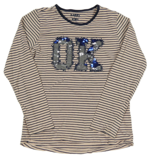 Ružovo-tmavomodré pruhované tričko s písmeny z překlápěcích flitrů TCM