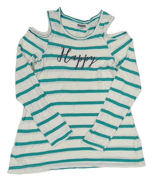 Bielo-jadeitové pruhované tričko s nápisom a volnými rameny YIGGA