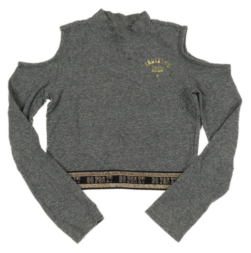 Sivý melírovaný crop rolák s číslom a zlatými pruhmi a volnými rameny Page one young