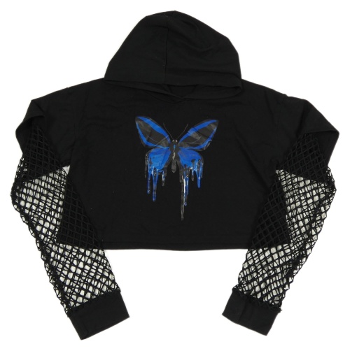 Čierne crop tričko s perforovanými rukávy a motýlkom a kapucňou Shein