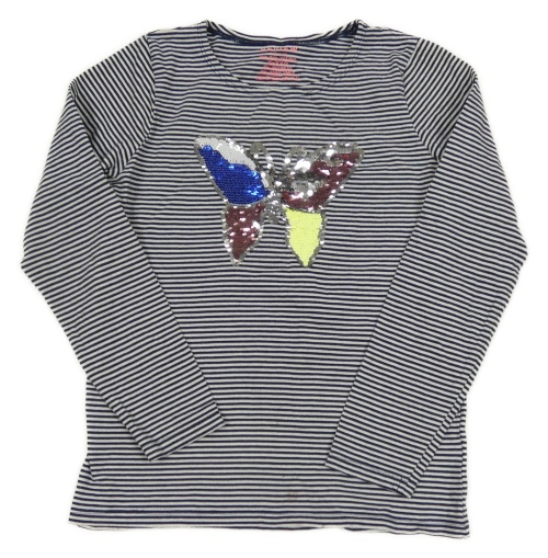 Tmavomodro-biele pruhované tričko s motýlkem z překlápěcích flitrů REVIEW