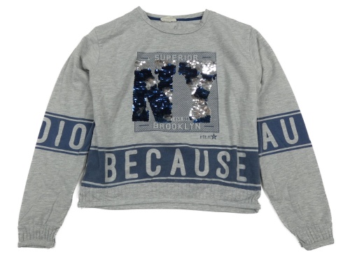 Sivo-tmavomodré crop tričko s nápisom a překlápěcími flitre