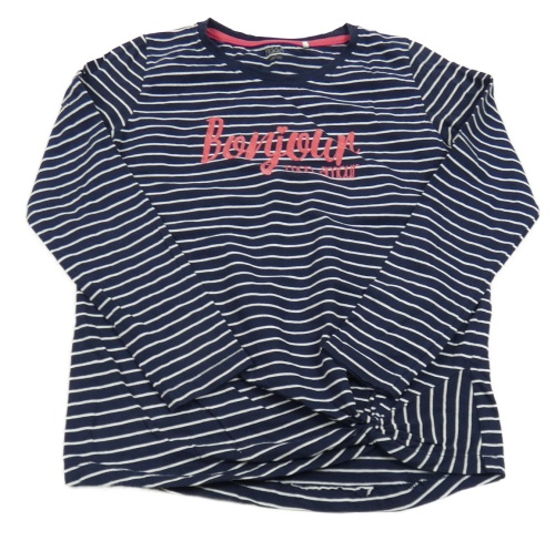 Tmavomodro-biele pruhované tričko s nápismi a překřížením YIGGA