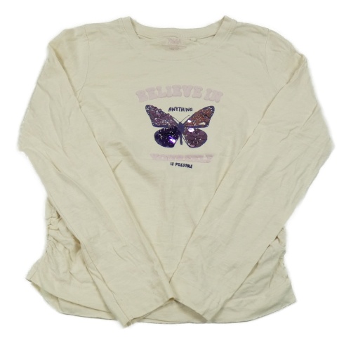Smotanové melírované tričko s motýlkom s flitrami a nápismi a nařasením YIGGA