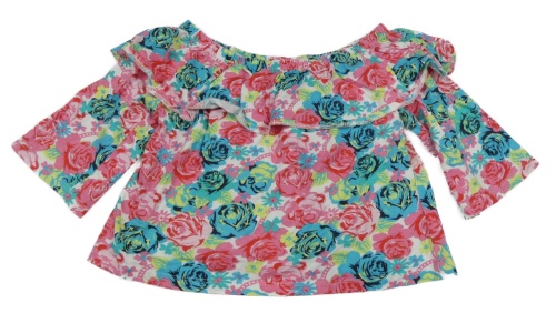 Bielo-ružovo-zelené kvetované crop tričko s volánikom