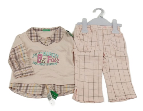 Nové - 2Set - Svetloružové tričko s číslom a nápismi a všitou kockovanou blúzková ou + světlerůžovo/bílo/hnědé kockované nohavice Benetton