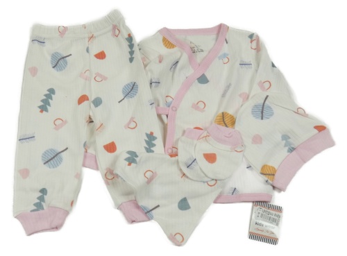 Nové - 5set - Biele rebrované zavinovací tričko s obrázky + lehké tepláky + žebrovaná čepice + rukavičky + slinták