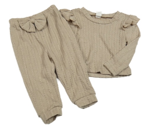 2set - Béžové vzorované úpletové tričko s volánky + tepláky s mašlou Shein