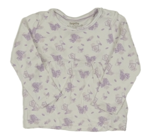 Bielo-fialové tričko s vtáčky a kvietkami lupilu
