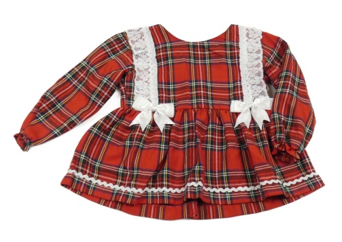 Červeno-zeleno-modrá kockovaná šatová tunika čipkou a mašľami