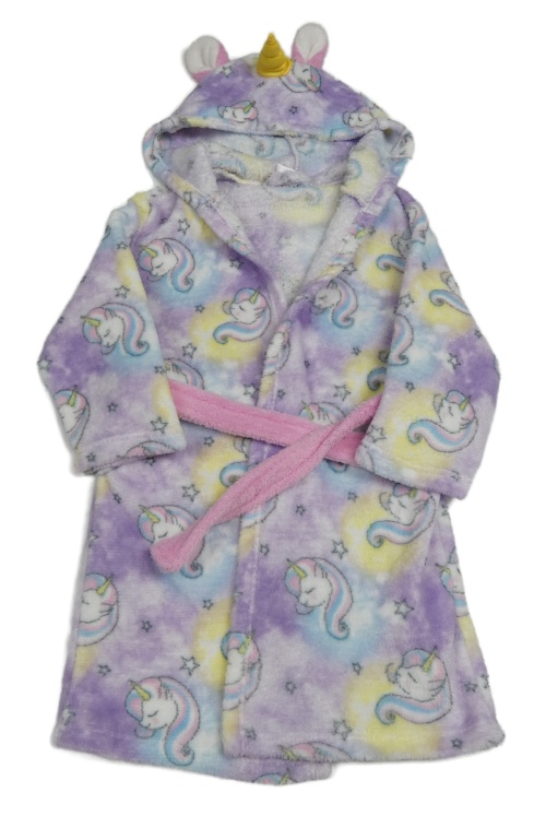 Fialovo-žlto-svetlomodrý plyšový župan s jednorožcami a kapucňou