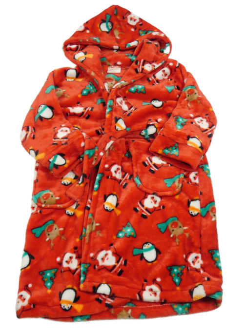 Červený chlpatý župan s vánočním motívom a kapucňou