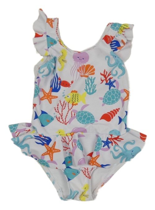 Biele jednodielne plavky s mořskými živočichy a volánikmi