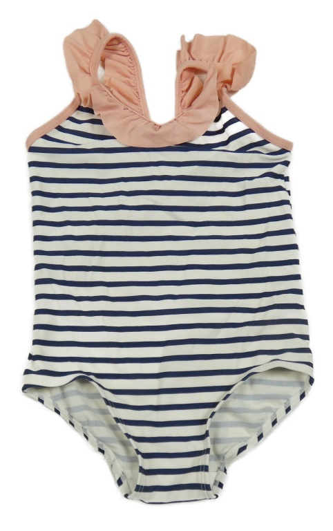 Bielo-tmavomodro-pudrové pruhované jednodielne plavky s volánikom