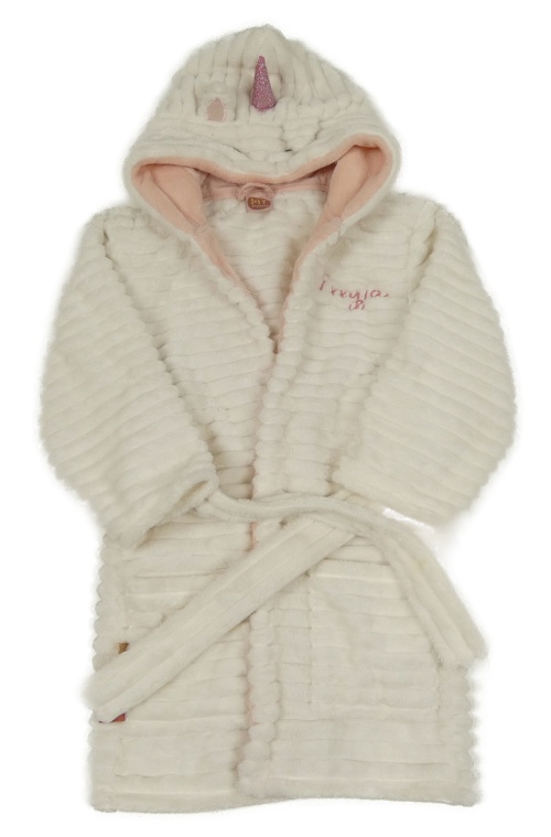 Biely rebrovaný plyšový župan s kapucí - jednorožec