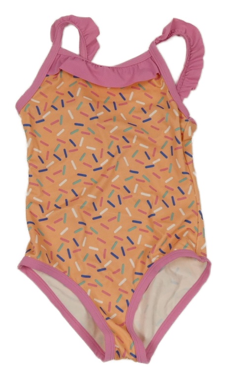 Meruňkovo-ružovo-farebné vzorované jednodielne plavky s volánikmi