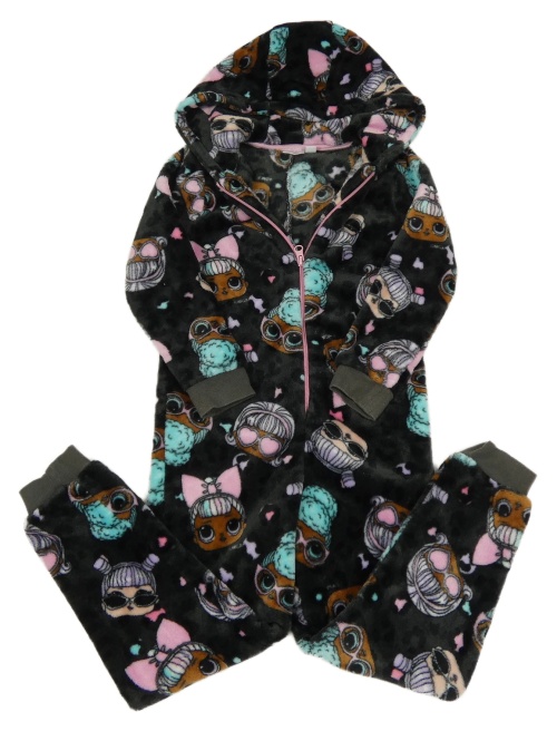 Čierna vzorovaná chlpatá kombinéza s potiskem LOL Suprise a kapucňou