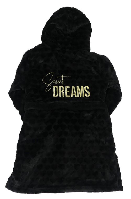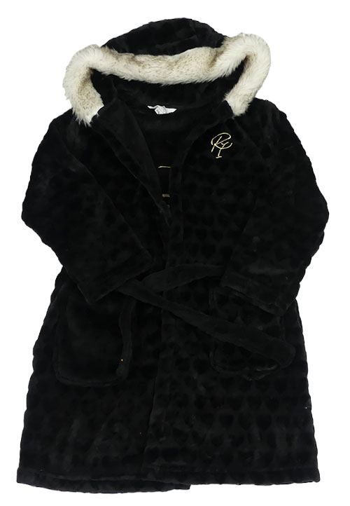 Čierny plyšový župan so srdiečkami a logom a nápismi a kapucňou s kožešinou RIVER ISLAND