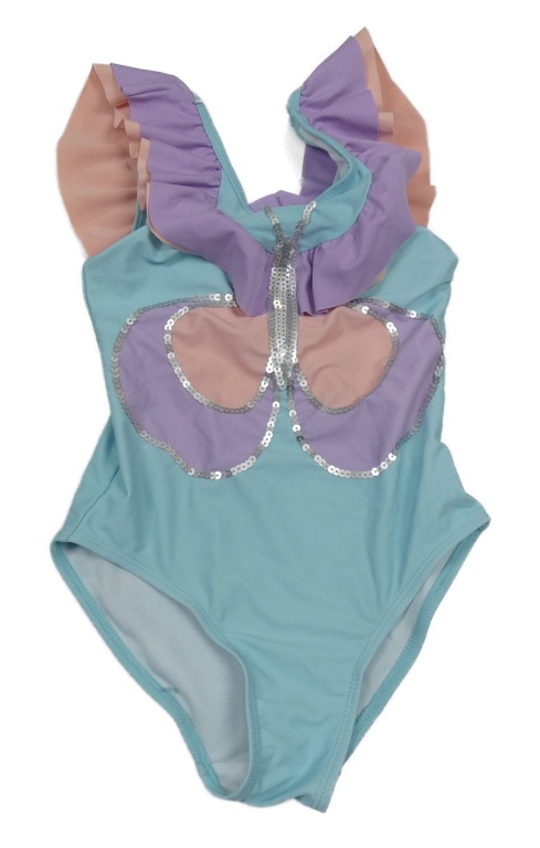Světlemodro-fialovo-broskvové jednodielne plavky s motýlkom s flitrami a volánikmi Topolino