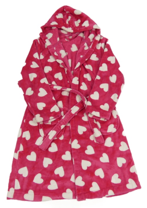 Malinový plyšový župan s bielými srdiečkami a kapucňou George
