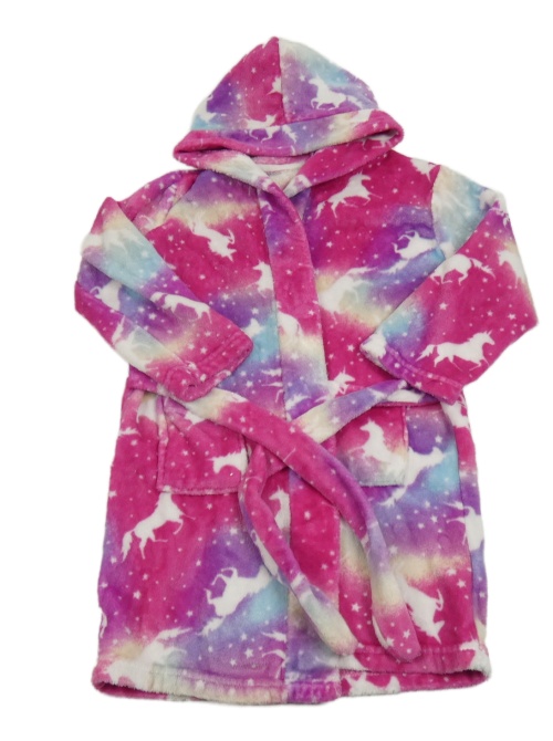 Tmavorůžovo-fialovo-svetlomodrý plyšový župan s jednorožcami a kapucňou