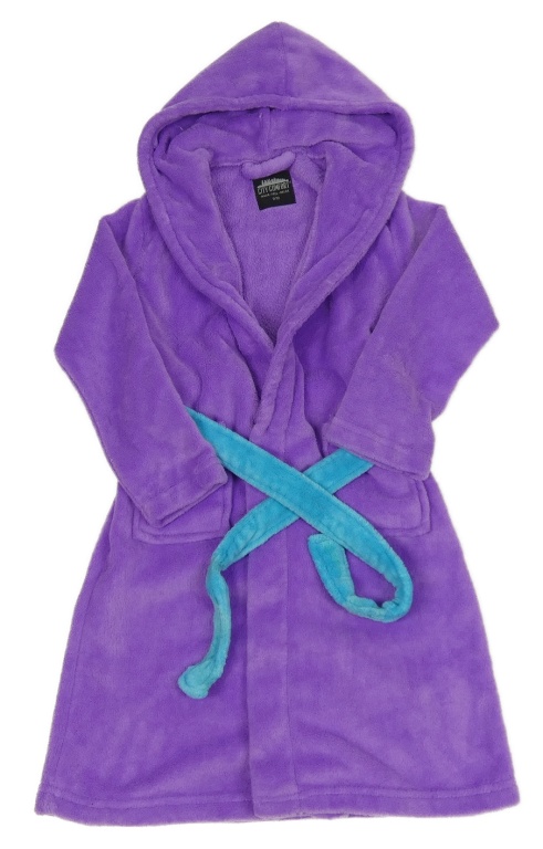 Fialový chlpatý župan s opaskom a kapucňou