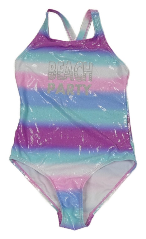 Modro-fialovo-ružové pruhované trblietavé jednodielne plavky s nápisom