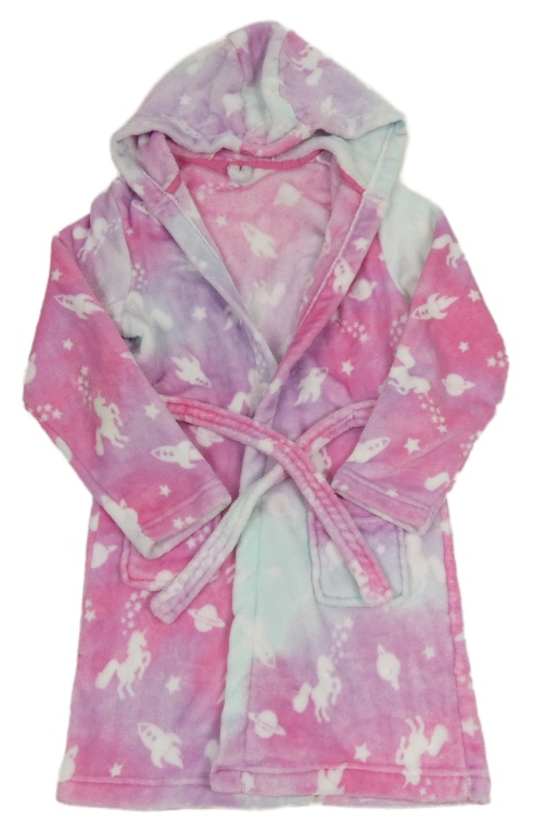 Ružovo-svetlomodrý vzorovaný chlpatý župan s jednorožcami a kapucňou
