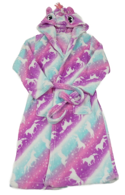 Ružovo-modro-biely vzorovaný chlpatý župan s jednorožcami a kapucňou