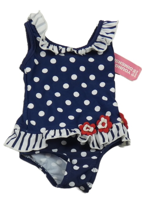 Nové - tmavomodro-biele bodkovaná é jednodielne plavky s 3D kvety a volánikmi YD