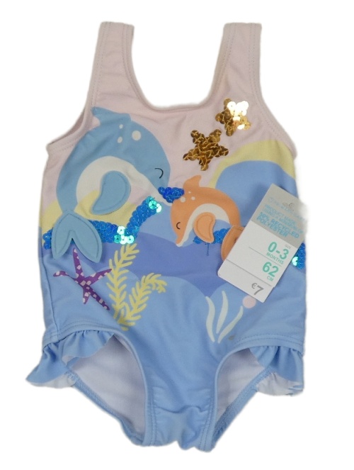 Nové - světlemodro/růžové jednodielne plavky s delfínky a flitrami a volánikmi PRIMARK