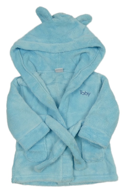 Azurový plyšový župan s nápisom a kapucňou s uškami