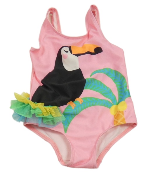 Neónově ružové jednodielne plavky s tukanom a farebnymi volániky
