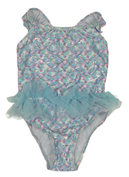 Světlemodro-ružové vzorované jednodielne plavky s tylovymi volániky Primark