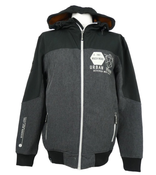 Pánska sivo-čierna softshellová jarná bunda s nápisom a kapucňou Much More