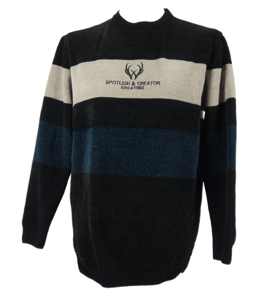 Pánsky čierno-béžvo-tmavomodrý pruhovaný žinylkový sveter s logom