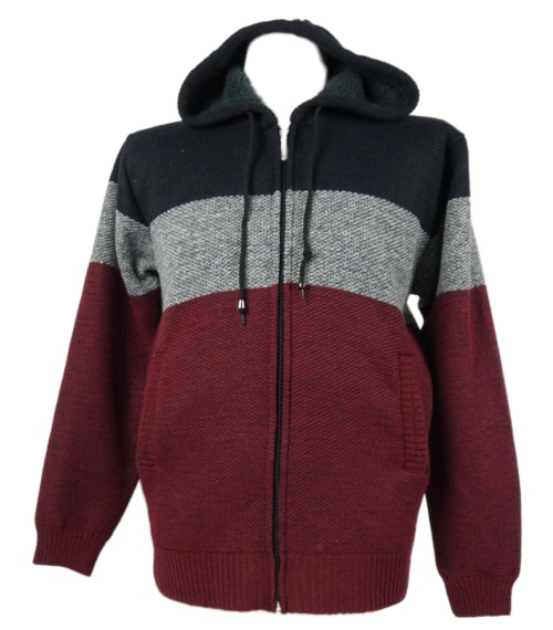 Pánsky tmavomodro-sivo-vínový pruhovaný zateplený prepínaci sveter s kapucňou