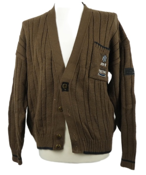Pánsky hnedý prepínaci vlnený sveter s nápismi Maser